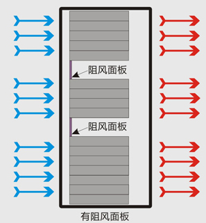 2.为了阻绝机柜内热空气重新循环至设备中,此时就要安装阻风面板,以避免机柜内的冷、热空气混合(如下图所示):